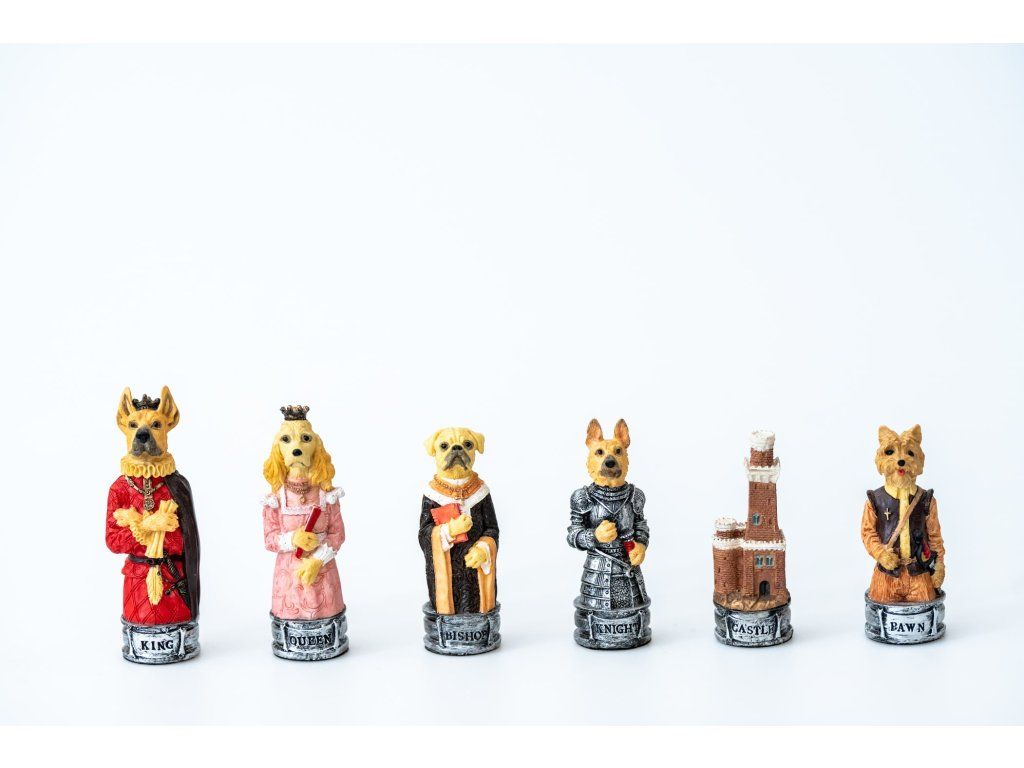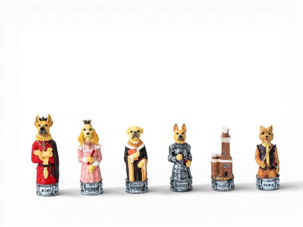 Piese de șah realizate manual din rășină întărită, cu model de pisici și câini. Acest set va fi pe placul tuturor iubitorilor de animale.