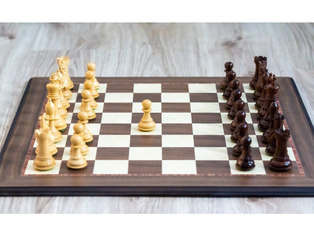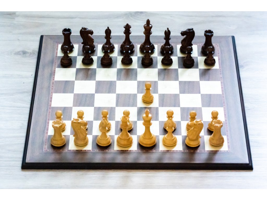 Tablă de șah din lemn de nuc și platan. Există un tiv decorativ pe părțile laterale.