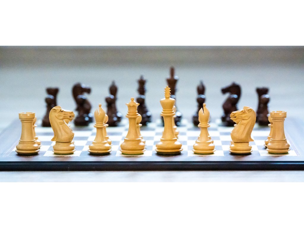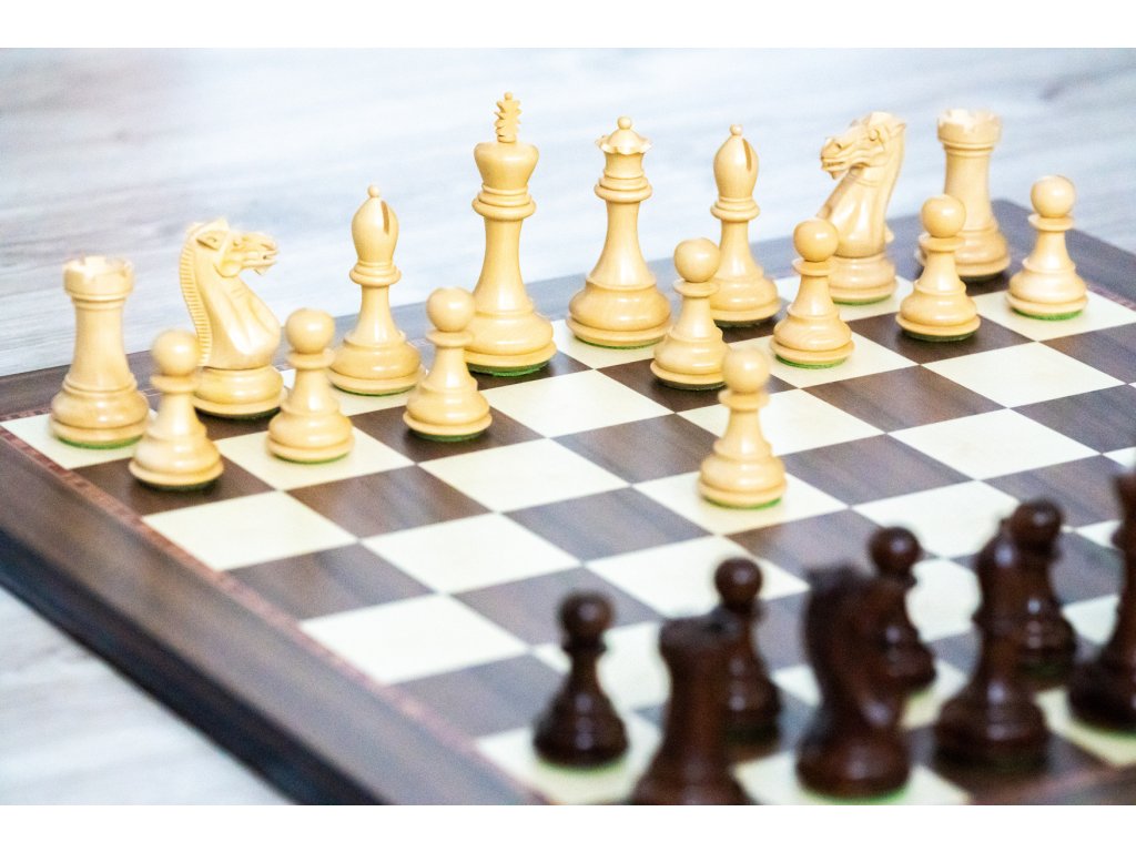 Piese de șah realizate din lemn de palisandru cu echilibrare dublă și finisare manuală.