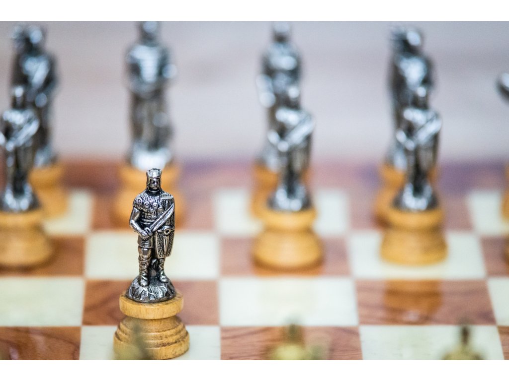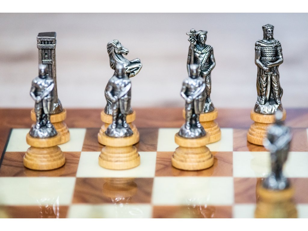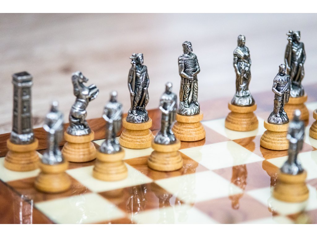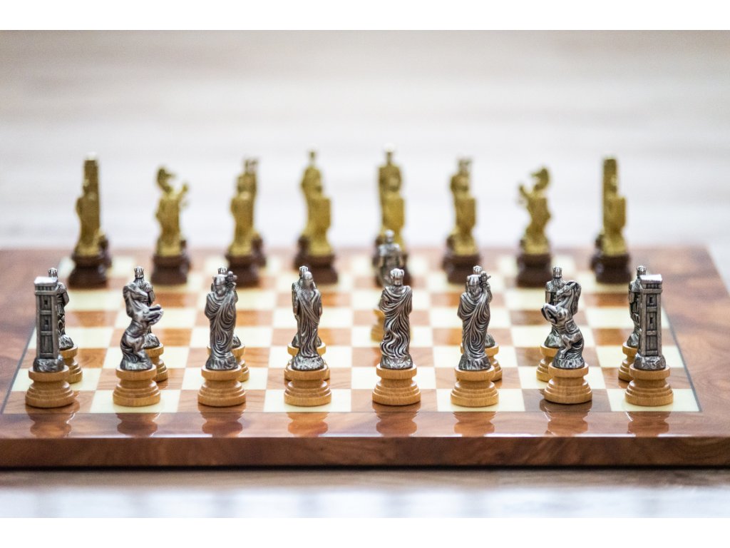 Acest set de șah elegant reprezintă liniile unei legiuni romane care se confruntă cu una dintre numeroasele forțe barbare cu care au luptat în timpul sutelor de ani de campanii militare romane din Europa.