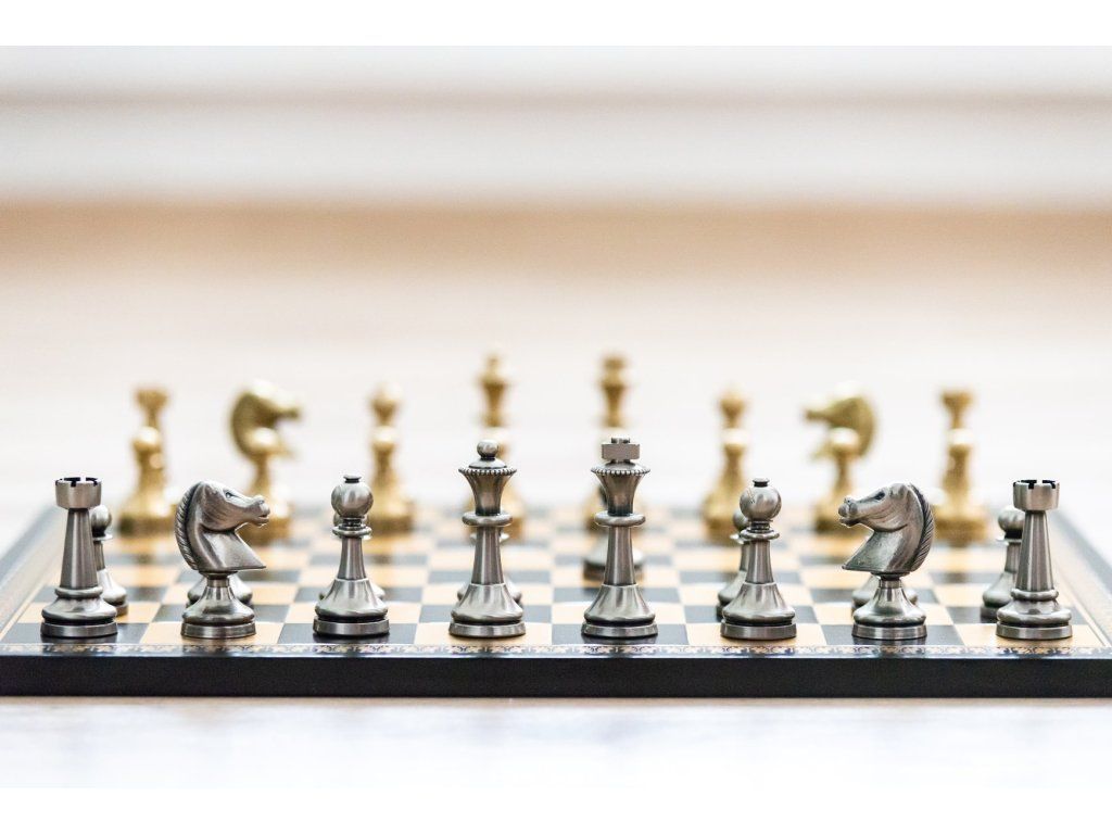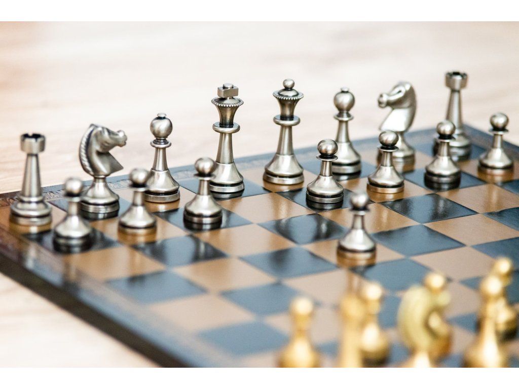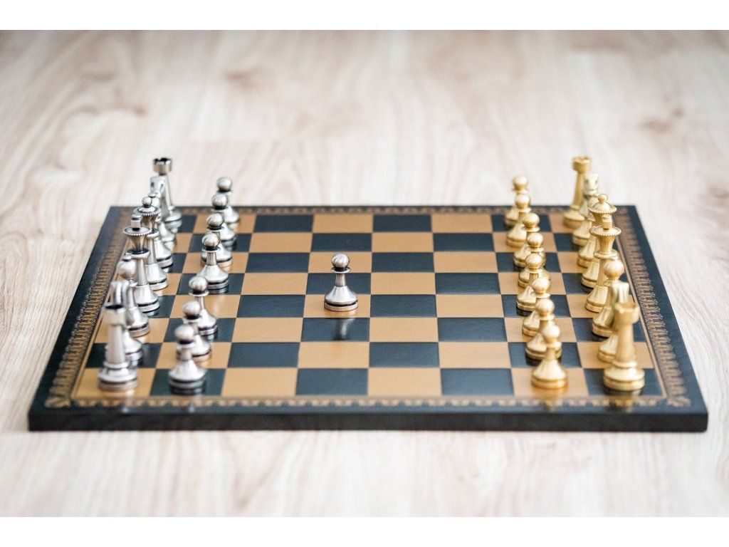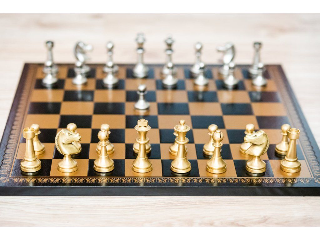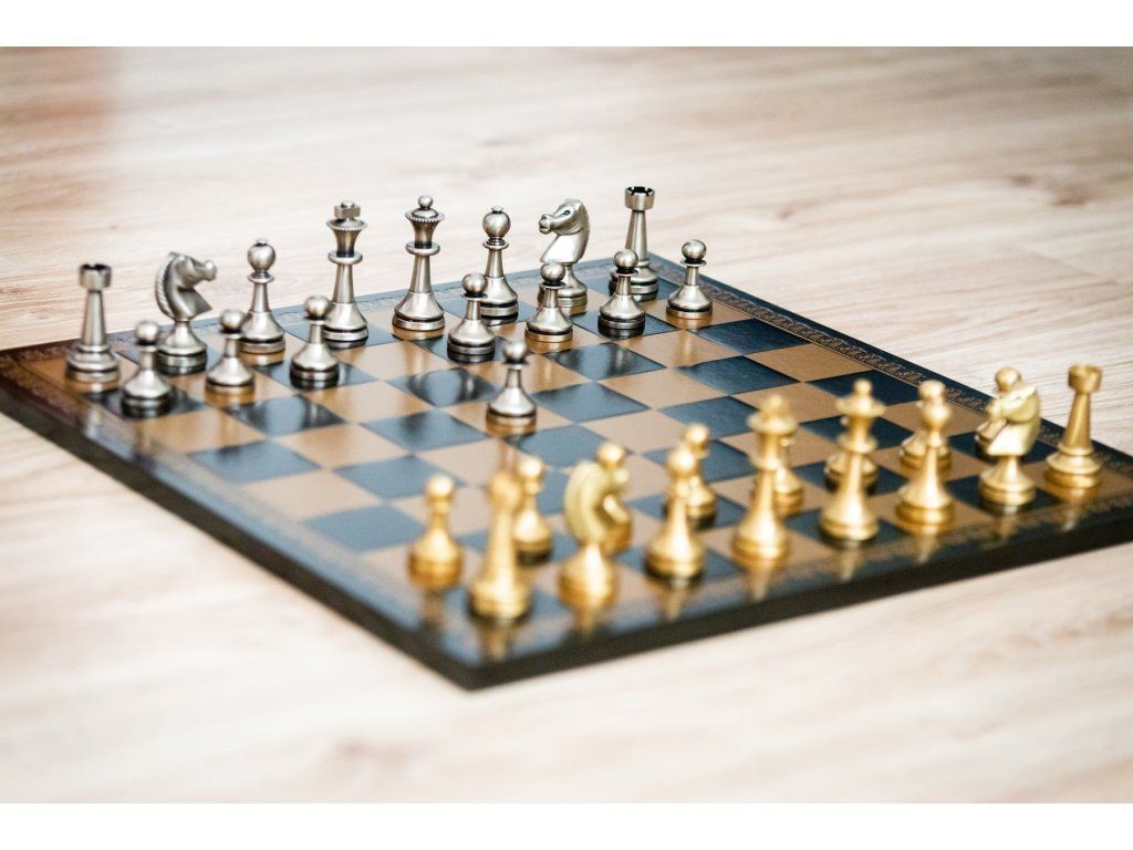 Piese de șah realizate din alamă cu finisare manuală. Piesele sunt un cadou potrivit, de exemplu, pentru zilele de naștere rotunde, pentru cunoscătorii șahului sau în scopuri reprezentative.