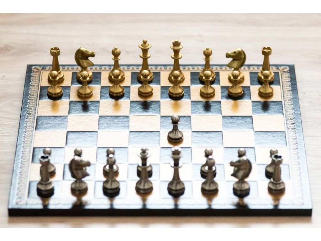 Piese de șah din alamă care se remarcă prin manoperă, greutate și aduc o experiență estetică neobișnuită atunci când jucați un joc de șah. Tablă de șah neobișnuită confecționată manual din lemn și acoperită cu piele artificială și decorată cu ornamente de culoare aurie pe margini.