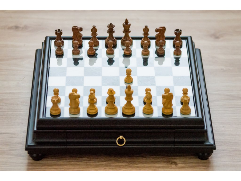 O versiune populară a pieselor Staunton într-un finisaj luxos din lemn de salcâm, echilibrat cu o bază moale.