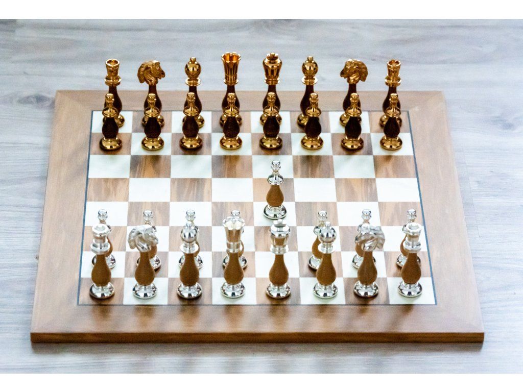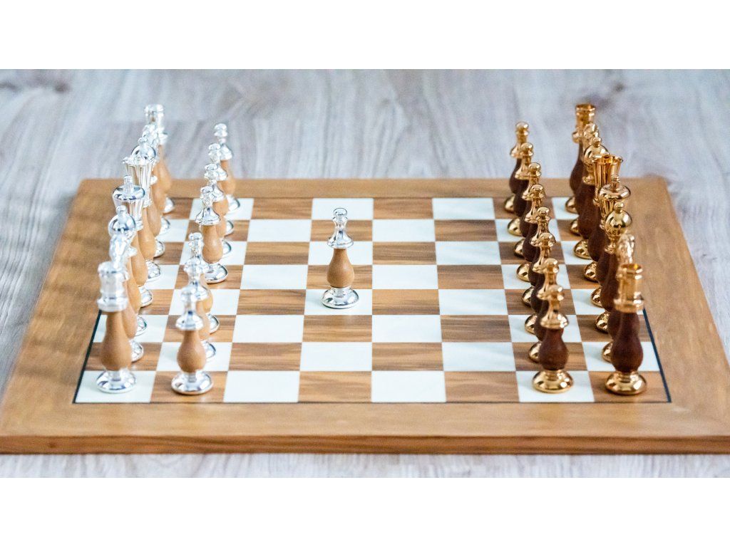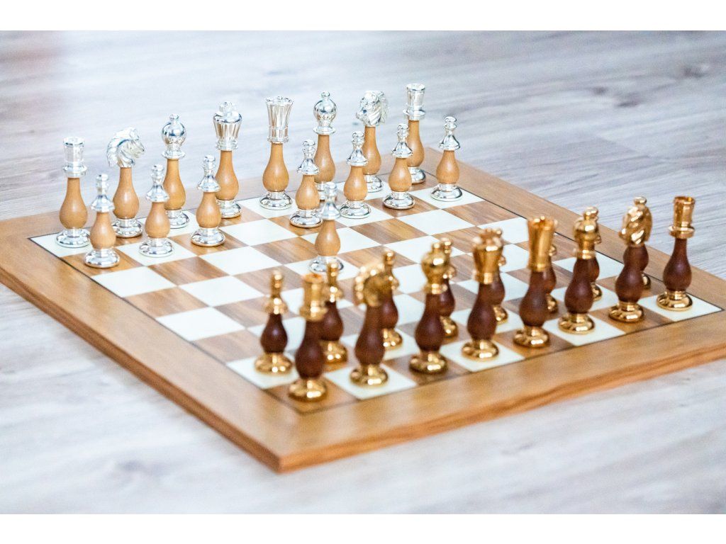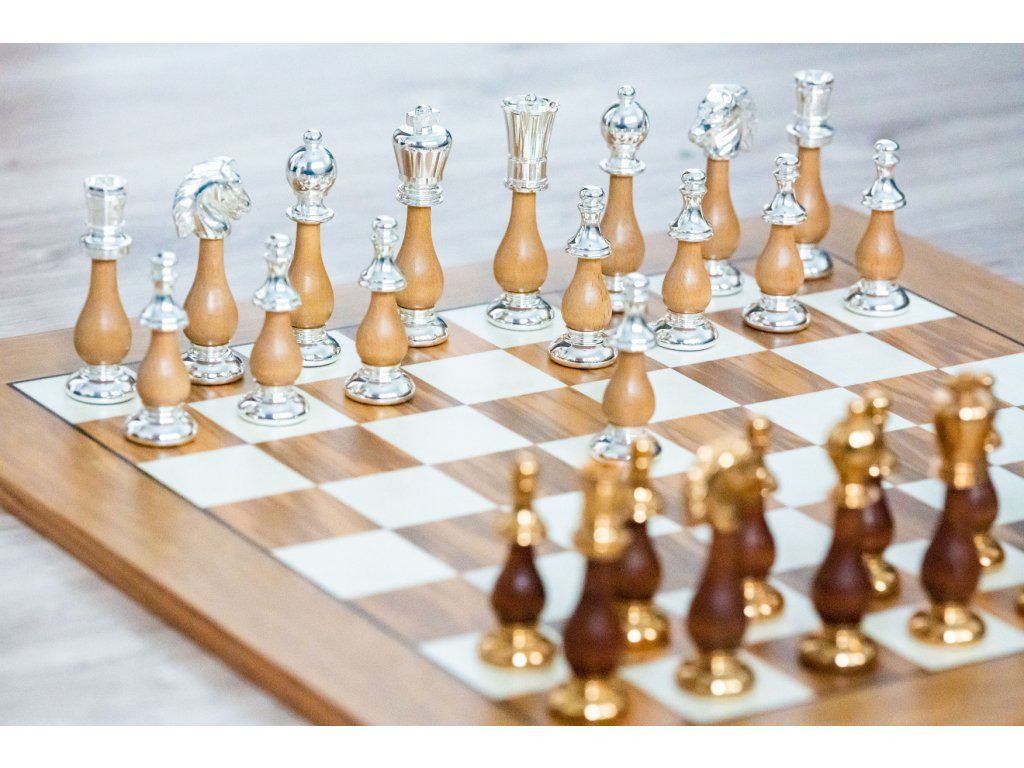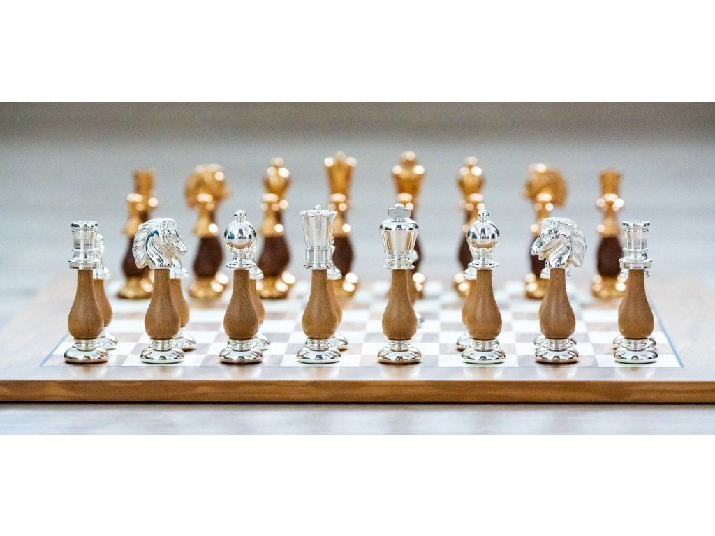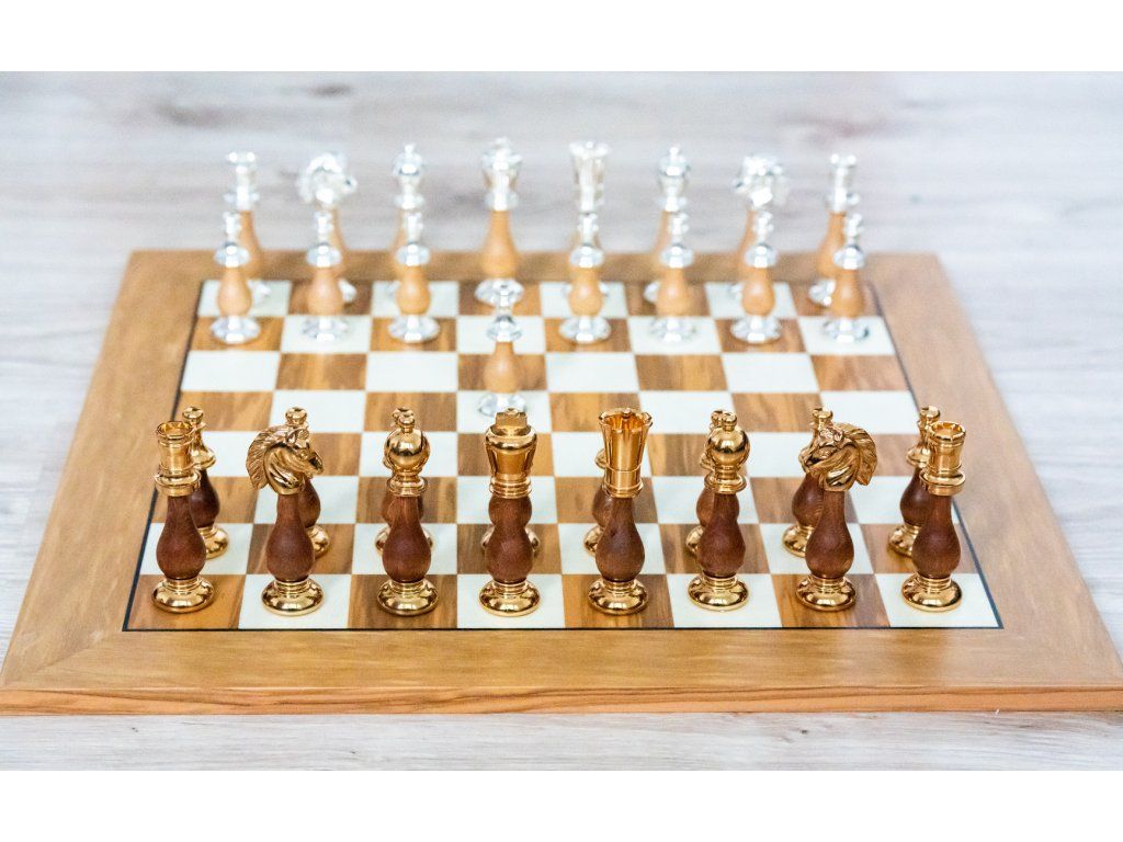 Piesele sunt realizate din alamă lustruită placată cu aur și argint și din lemn de calitate. Tablă de șah din lemn de măslin.