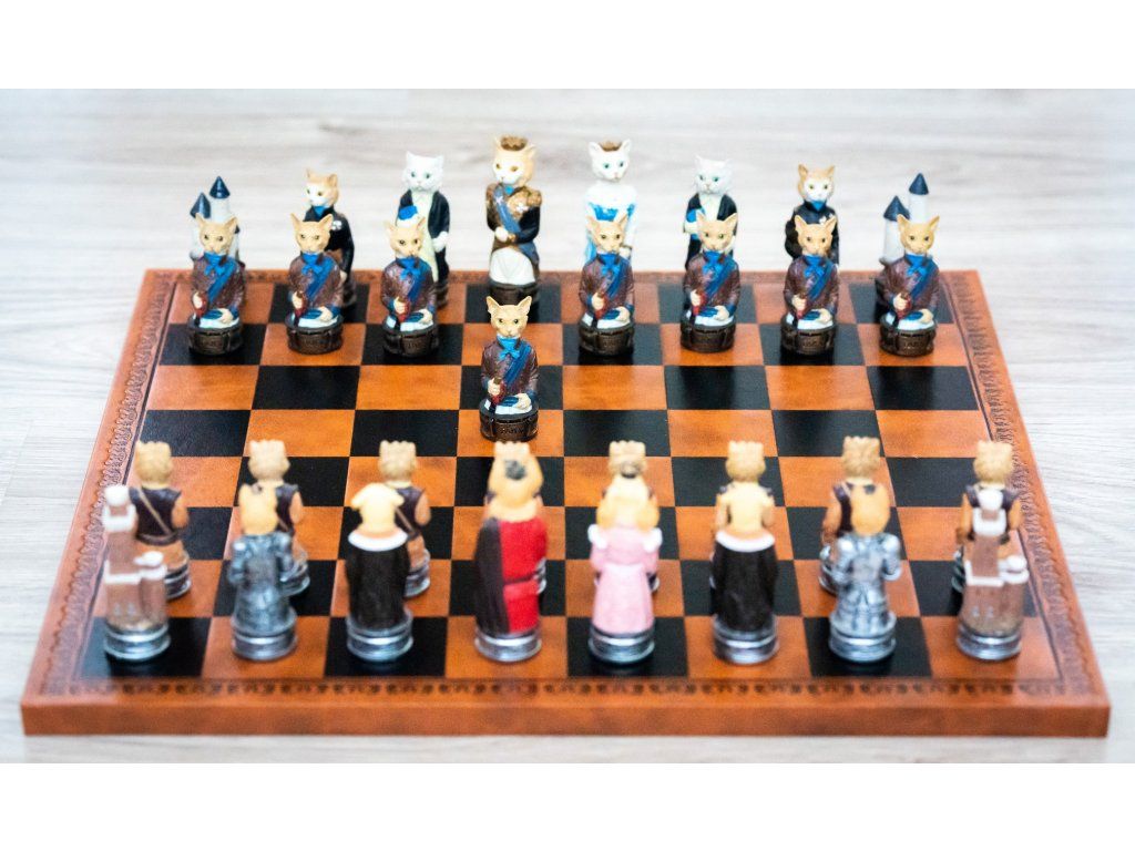 Piese de șah realizate manual din rășină întărită, cu model de pisici și câini. Acest set va fi pe placul tuturor iubitorilor de animale.