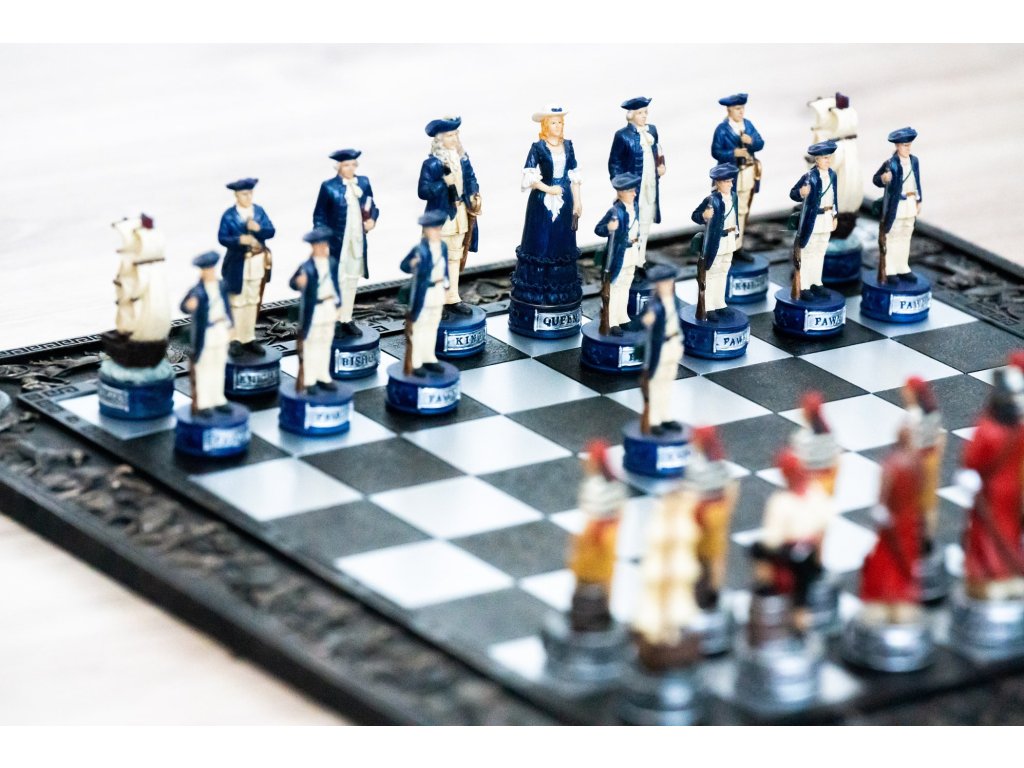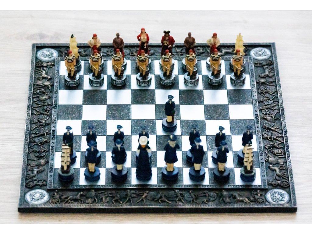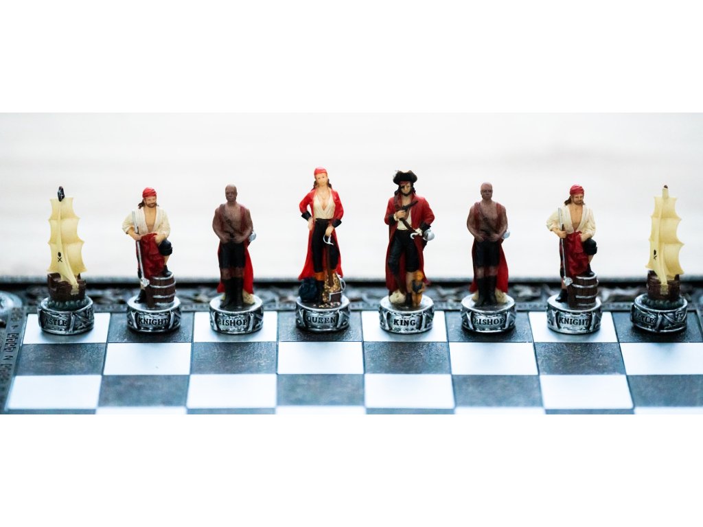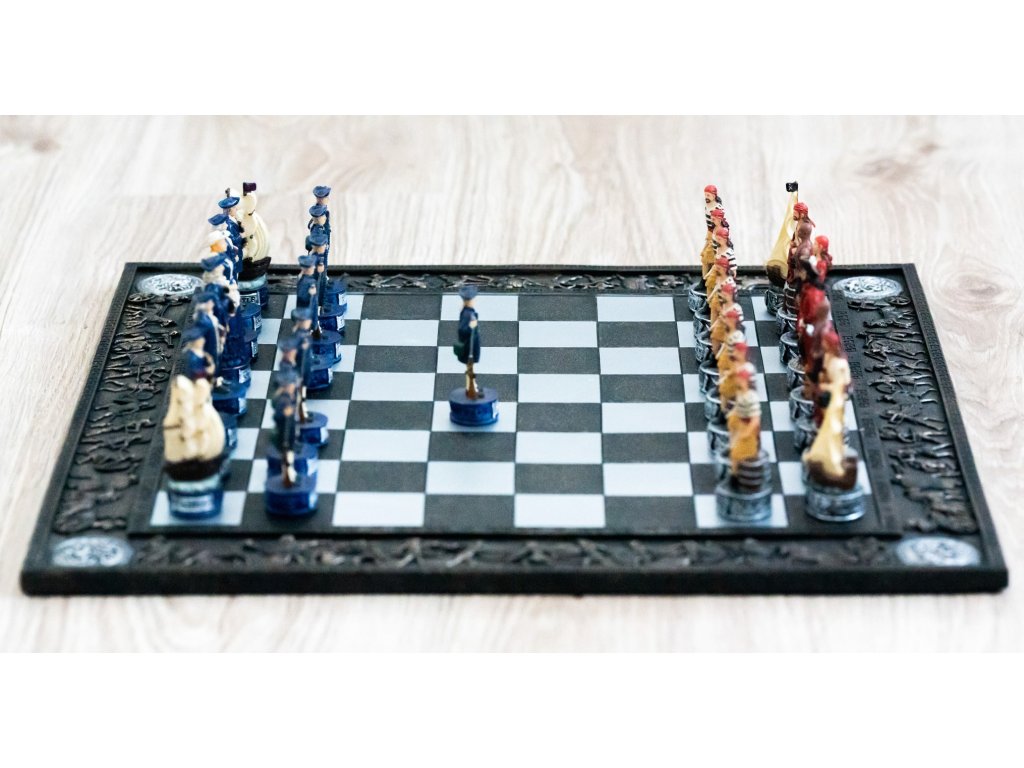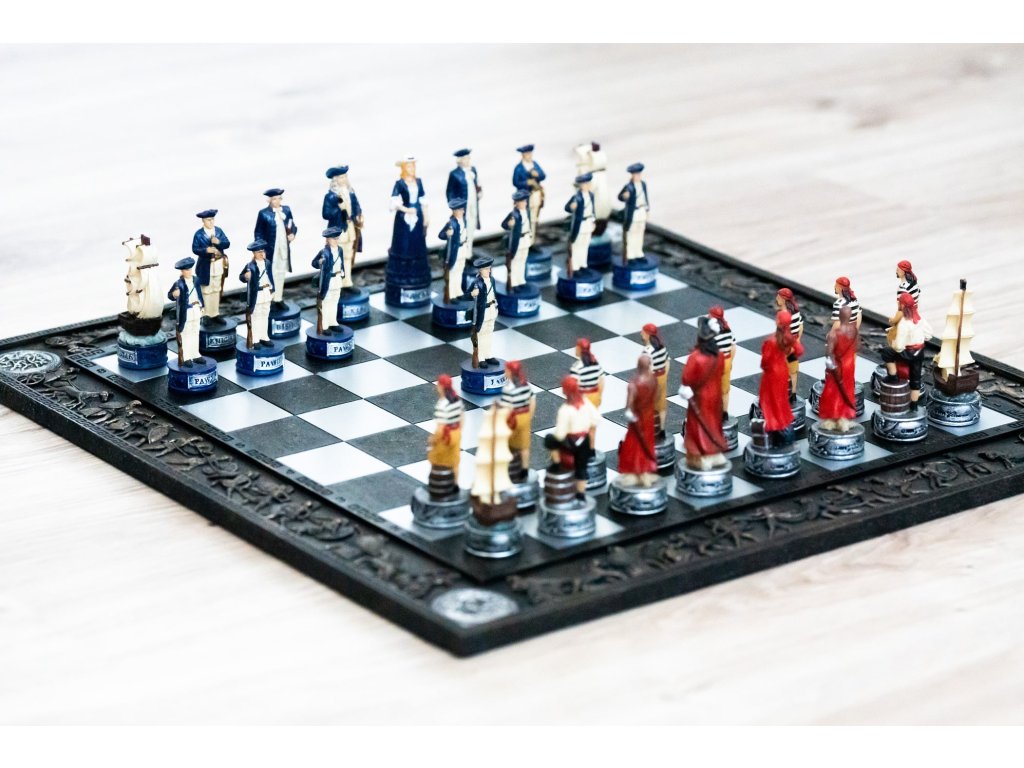 Piese de șah lucrate manual din rășină întărită în modelul marinarilor și piraților. Acest set va fi pe placul tuturor iubitorilor de bătălii navale.