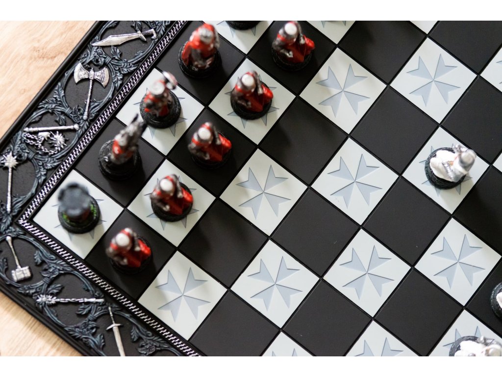 Piesele de șah pictate manual cu un motiv cruciat adaugă o notă de istorie jocului dumneavoastră de șah. Tablă de șah cu motive ale cruciadelor realizată cu bază de rășină.