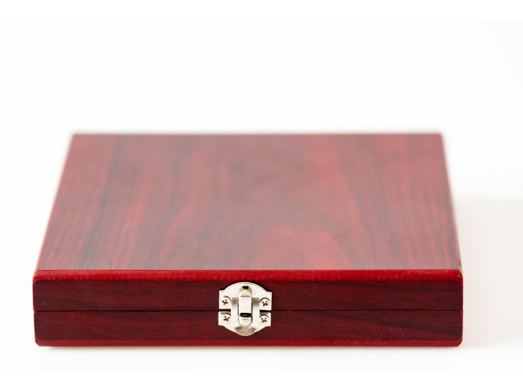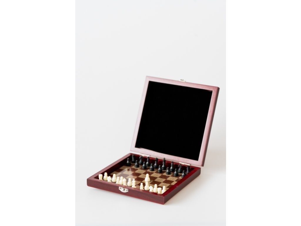 Set mic de șah magnetic de călătorie în cutie de lemn cu închidere ușoară.
