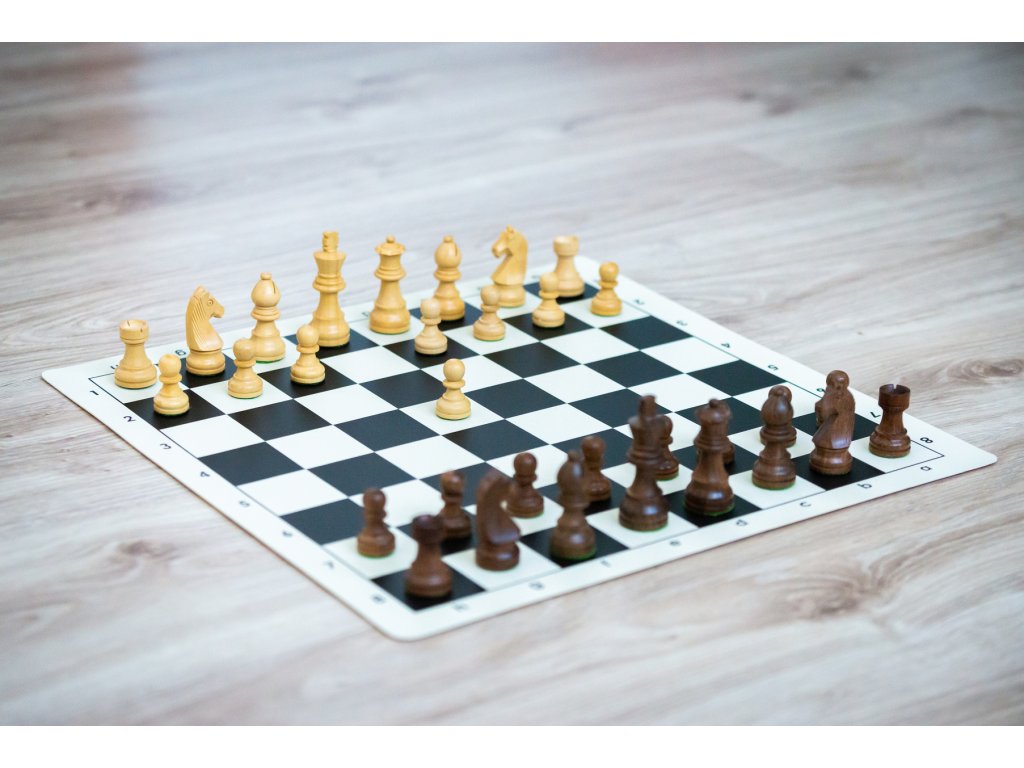 Set de șah de mărime medie, cu posibilitate de rulare. Piese realizate din lemn de palisandru.