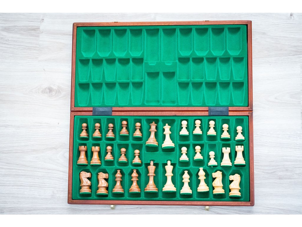 O versiune populară a pieselor clasice Staunton într-un finisaj luxos din lemn de salcâm, echilibrat cu o bază moale într-o dimensiune standard de concurs.