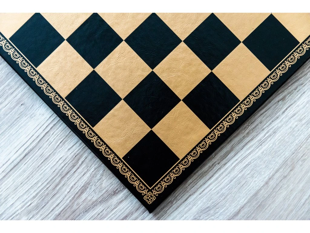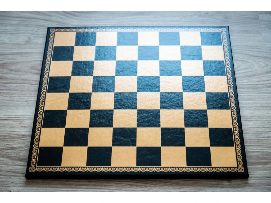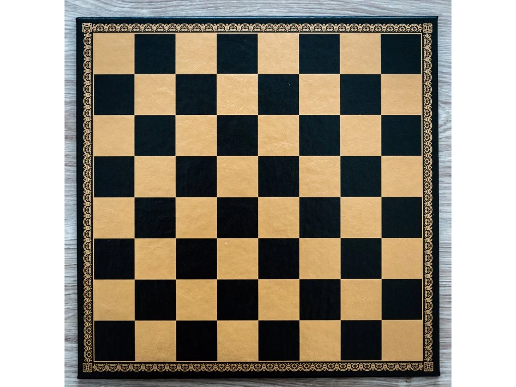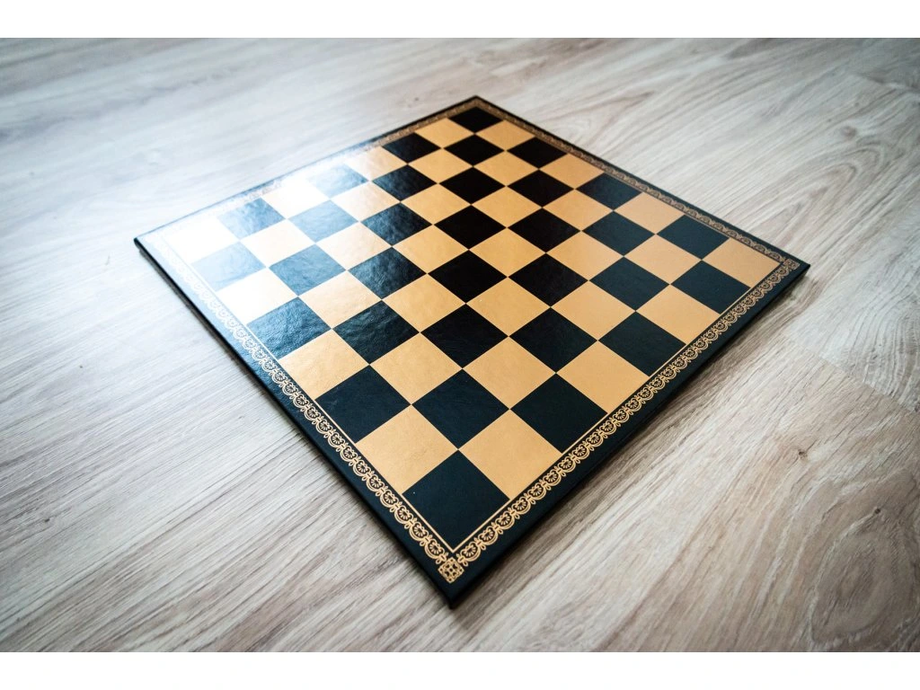 Tablă de șah neobișnuită confecționată manual din lemn și tapițată cu piele și decorată pe margini cu ornamente de culoare galbenă.